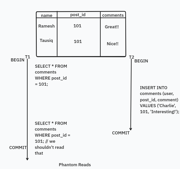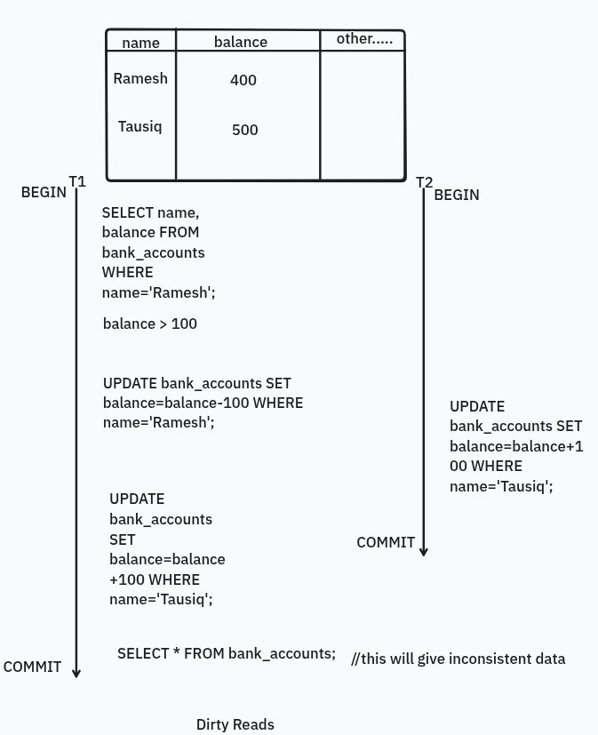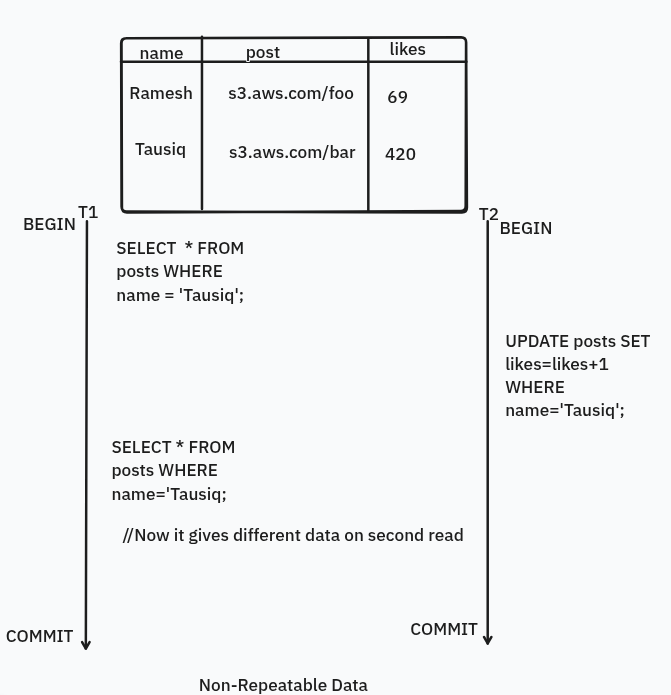 For e.g.: Above, you can see T1 reads and checks if balance > 100 or not for Ramesh, and updates the Ramesh’s balance, while T2 updates Tausiq’s balance, and same does T1 and then when T1 tries to read balance it gives incorrect data